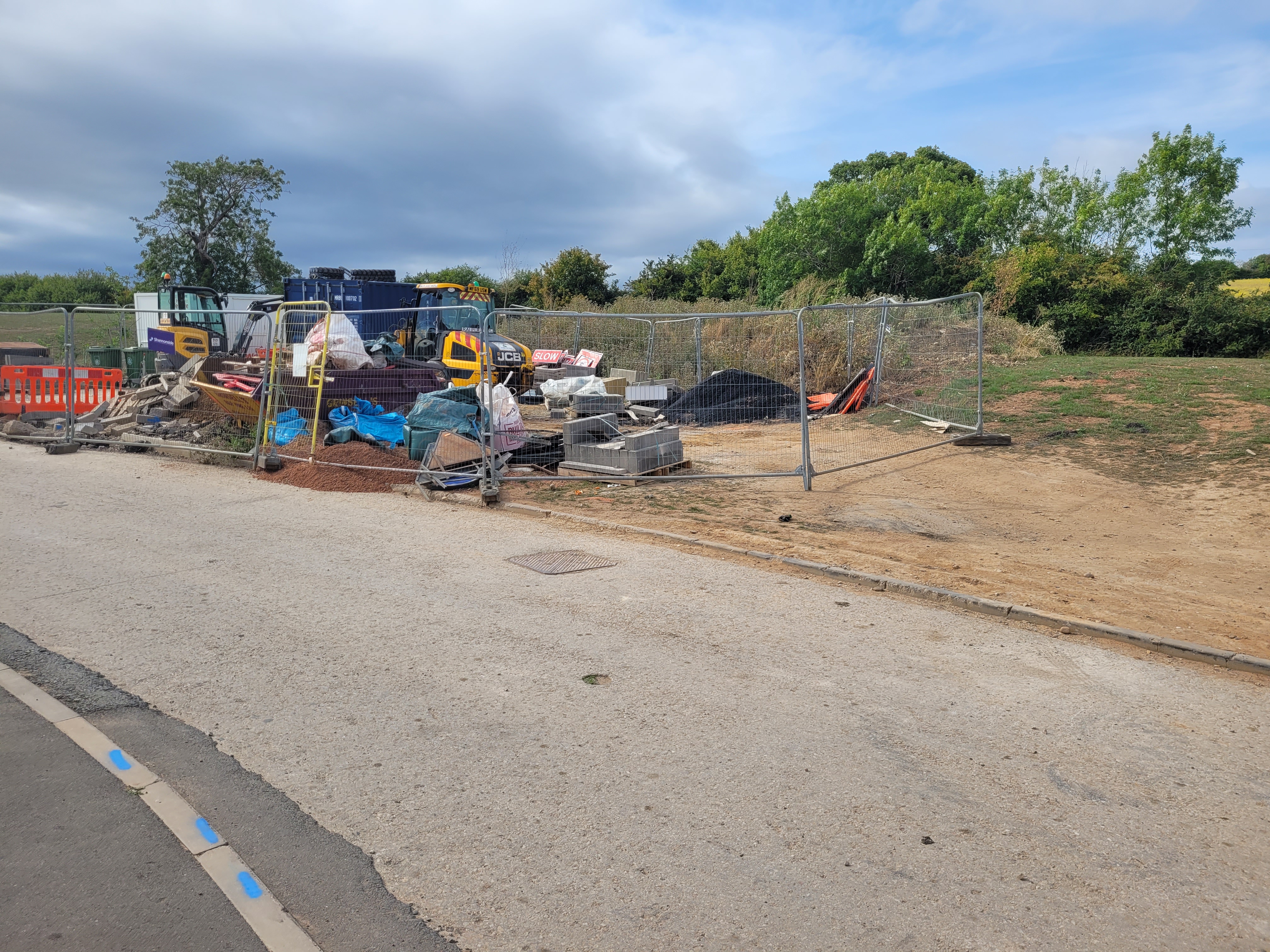 The storage compound at the back of the site (see image) needs to be removed with the area landscaped, and a nearby French drain needs to be connected. A small number of properties on Nason Way experienced flooding damage because this drain was not working properly and Taylor Wimpey have promised to put this right.